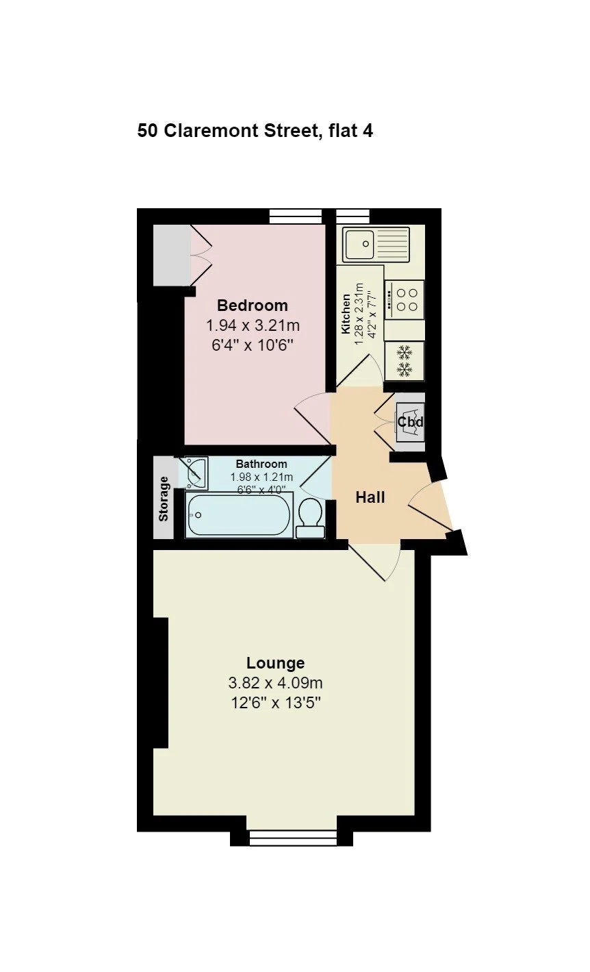The accommodation comprises of:- Entrance hallway with storage cupboard housing washing machine; spacious lounge with large street view window; kitchen with a range of wall and base units, electric oven and hob; double bedroom to the rear of the building with built-in storage cupboard; bathroom with overbath shower.